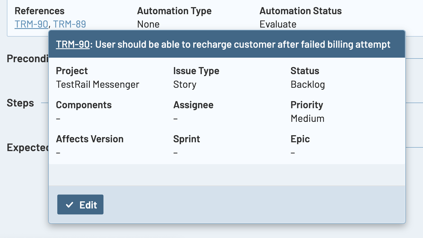 さらに、チームが使用している外部ツールに対応した参照プラグインが TestRail に用意されている場合、プラグインを使用して TestRail 内からツールのデータを取得できます。参照プラグインを有効化すると、リンクされた参照の上にカーソルを置いて外部ツールからデータを取得し、TestRail 内で参照することができます (ステータス、優先度、コンポーネント、バージョン、担当者など)。ホバリング ポップアップに表示するフィールドを設定できるほか、一部の統合機能では、TestRail を離れることなく外部ツールの情報を編集することもできます。