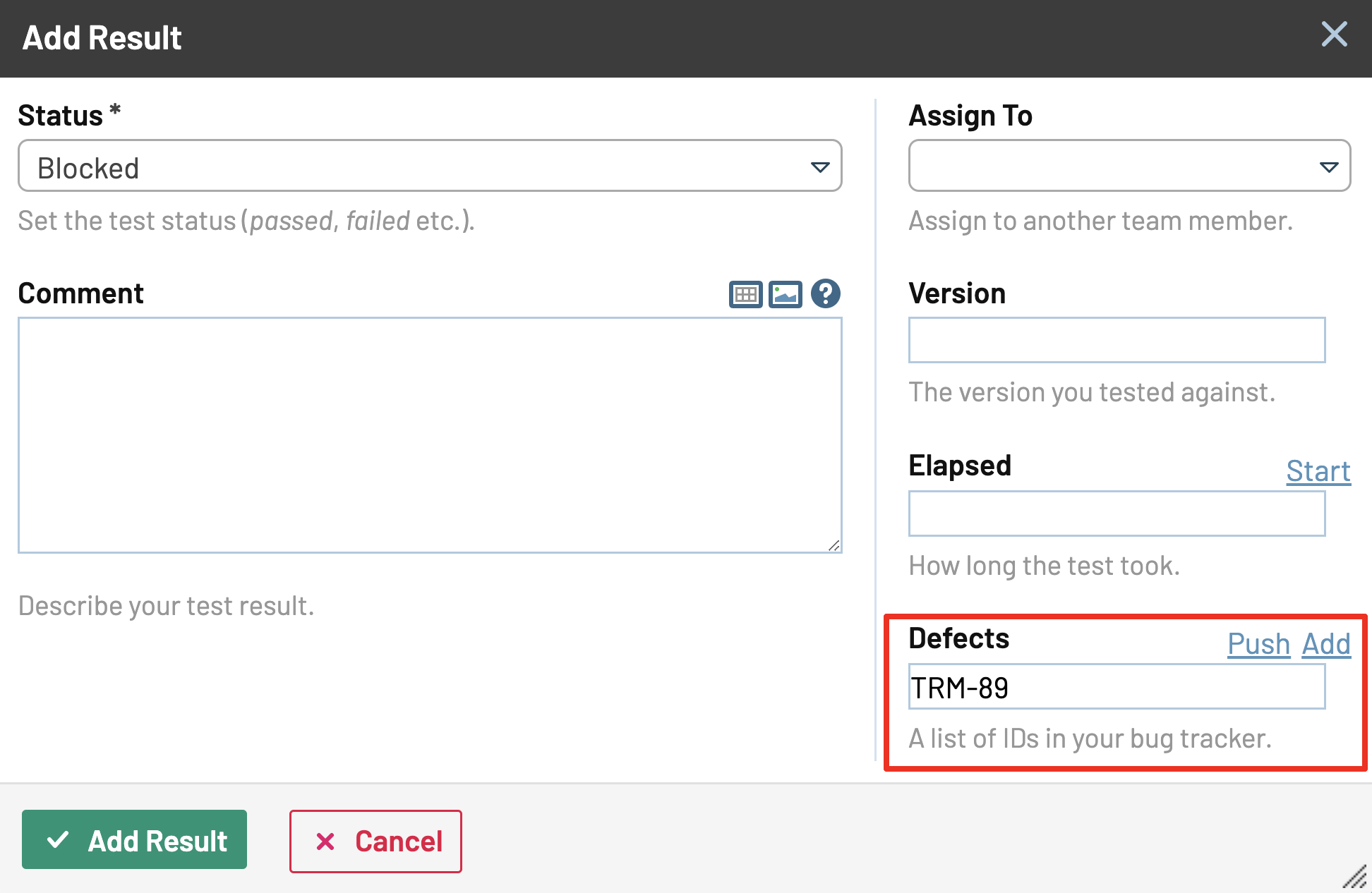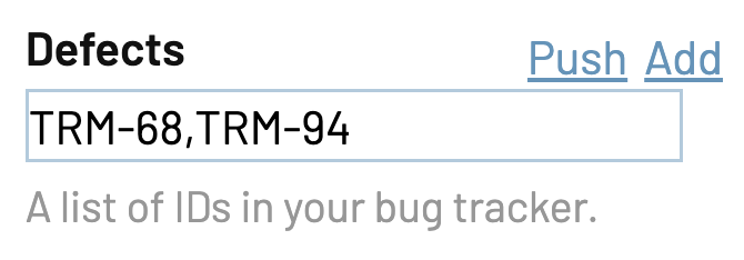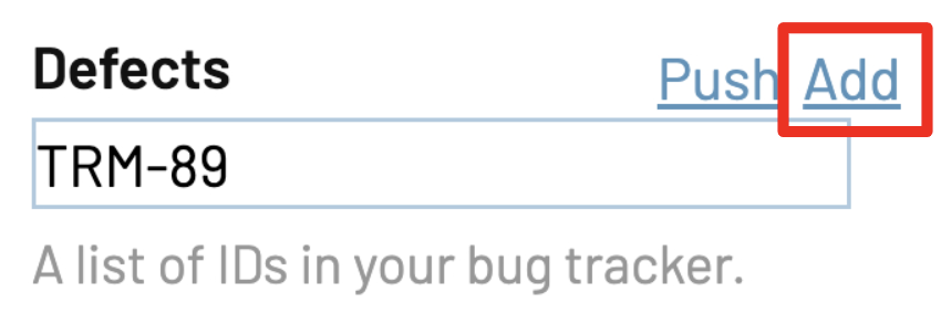 ランまたは計画にテスト結果を追加する際、[欠陥] フィールドを使用して外部のバグ、欠陥、課題トラッカーで追跡される欠陥、バグ、レポート、その他の課題タイプをリンクできます。