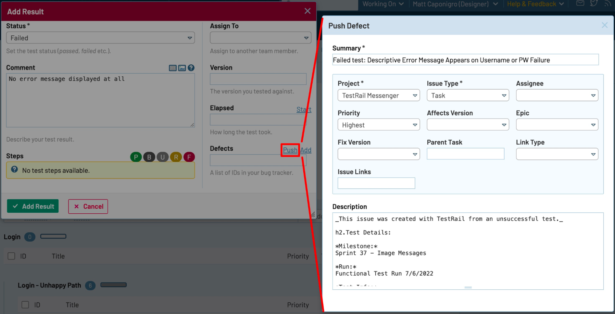 チームが使用している外部ツールに対応した欠陥プラグインが TestRail に用意されている場合、プラグインを使用して統合を拡張できます。欠陥プラグインを使用すると、TestRail を離れずに新規課題を作成して外部ツールにプッシュすることが可能になります。欠陥のプッシュ ダイアログをカスタマイズして、課題をサブミットする前にフィールドを編集できるよう、新規課題ビューに表示するフィールドを指定したり、レイアウト設定を変更したり、デフォルト値を設定したりできます。