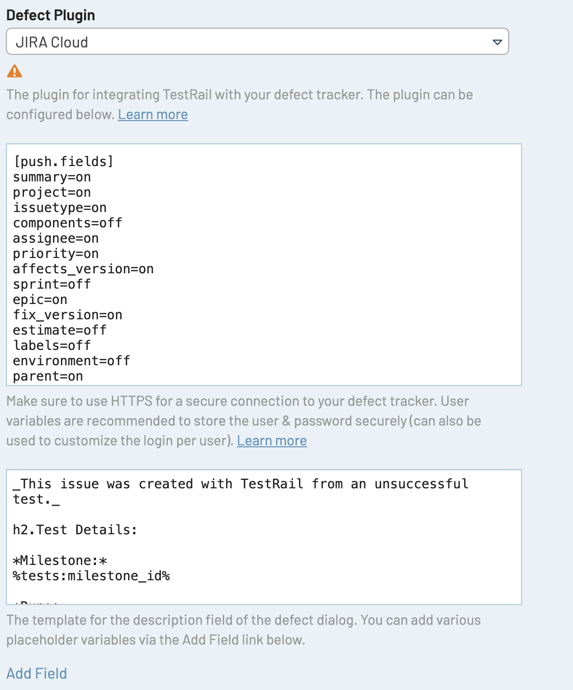 TestRail がプッシュする課題に対して自動生成する説明フィールドのテンプレートをカスタマイズすることもできます。最も重要なこととして、説明テンプレート内に変数を挿入し、欠陥をプッシュする際にテスト ケース、ラン、計画、マイルストーン、現在のテスト結果から動的にデータを取得することができます。