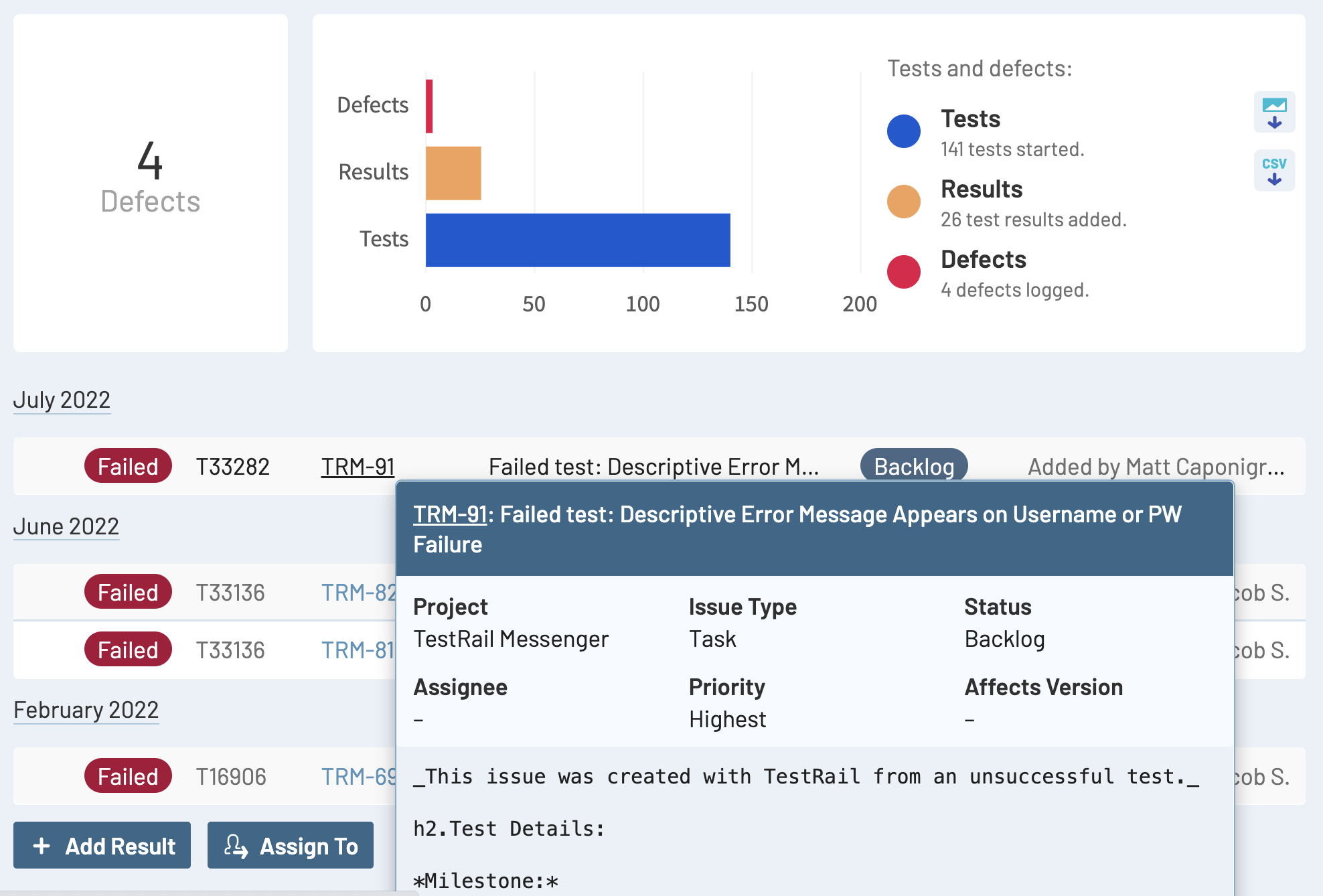 欠陥プラグインを設定すると、リンクされた欠陥の上にカーソルを置いたとき、ステータス、担当者、バージョンなどのデータをリアルタイムに参照できます。欠陥ホバリング プレビュー ウィンドウに表示されるフィールドをカスタマイズできるほか、一部の欠陥プラグインでは、TestRail を離れることなく、ホバリング プレビュー ウィンドウから外部ツールのデータを編集することもできます。