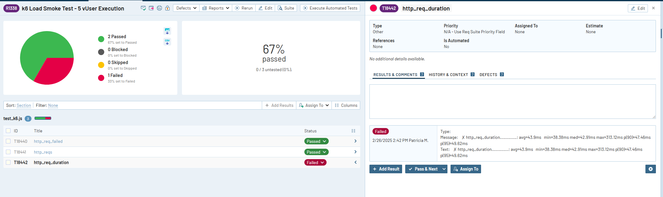 On the Test Runs & Results page, we can see that a test run with the name k6 Test Run was created. By opening it we can dig further into the details of each automated test result and perform a high level analysis of why any test is failing since the error message provided by the test automation framework is also registered on the test result, as you can see on the image below.