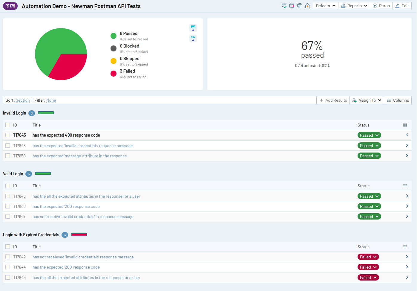 trcli -y -c "trcli-config.yml" parse_junit -f "./reports/newman_junit.xml" --title "Automation Demo - Newman Postman API Tests"