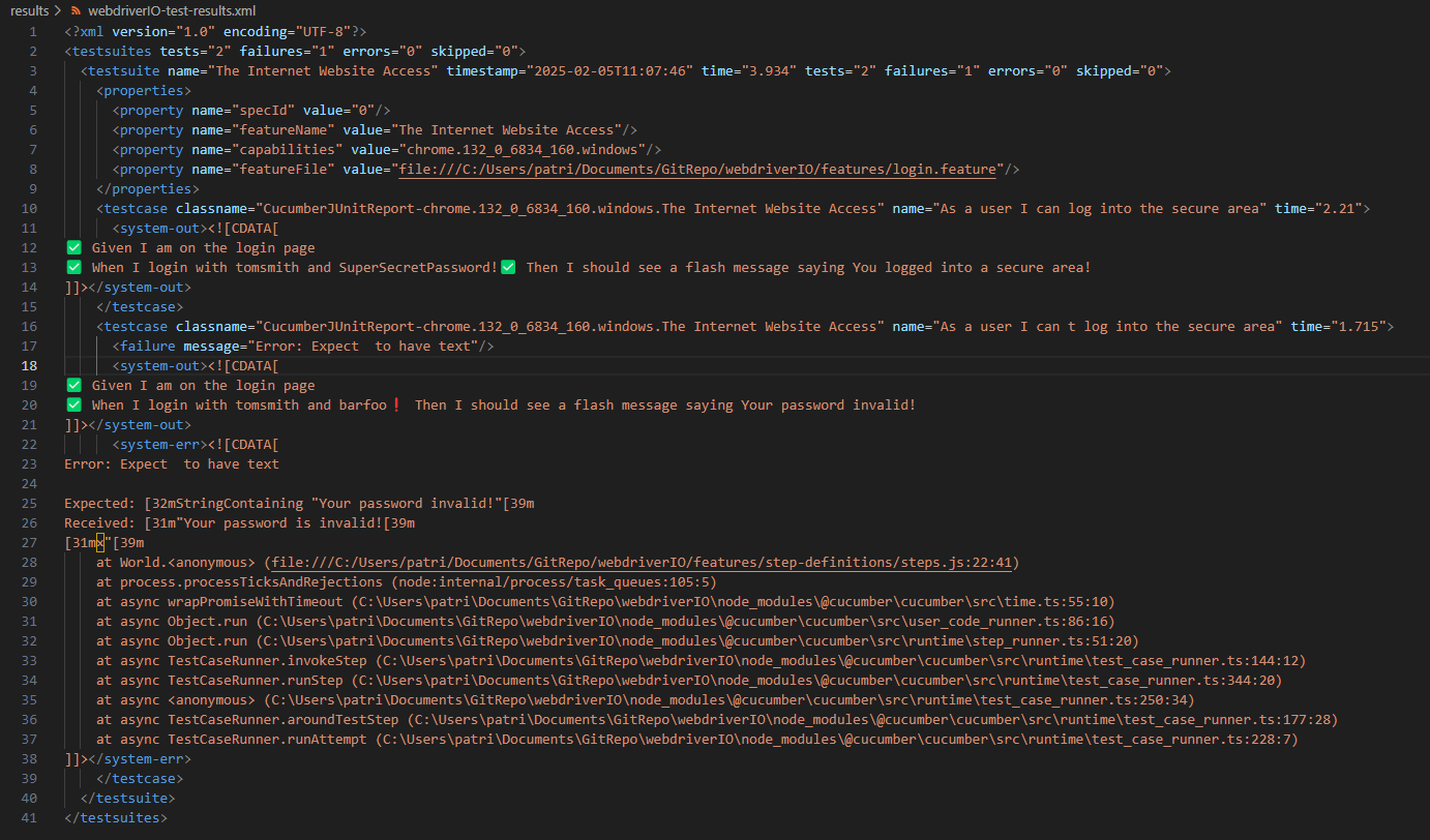 同じコマンド プロンプトで次のコマンドを実行し、プロジェクトで WebdriverIO のテストを実行して結果を JUnit XML 形式で保存します。