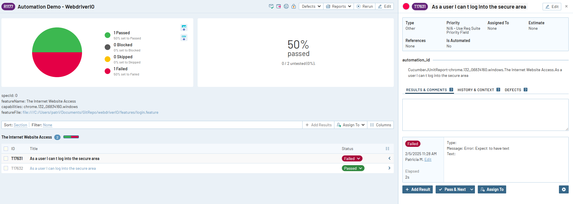 [テスト ランと結果] ページでは、Automation Demo – WebdriverIO という名前のテスト ランが作成されたのを確認できます。テスト ランを開き、各自動テスト結果の詳細をドリルダウンします。下の図に示すように、テストが失敗したときには、画面ショットなどの添付ファイルとともにテスト自動化フレームワークが出力したエラー メッセージもテスト結果に登録されているため、テストが失敗した理由の高度な解析が可能です。