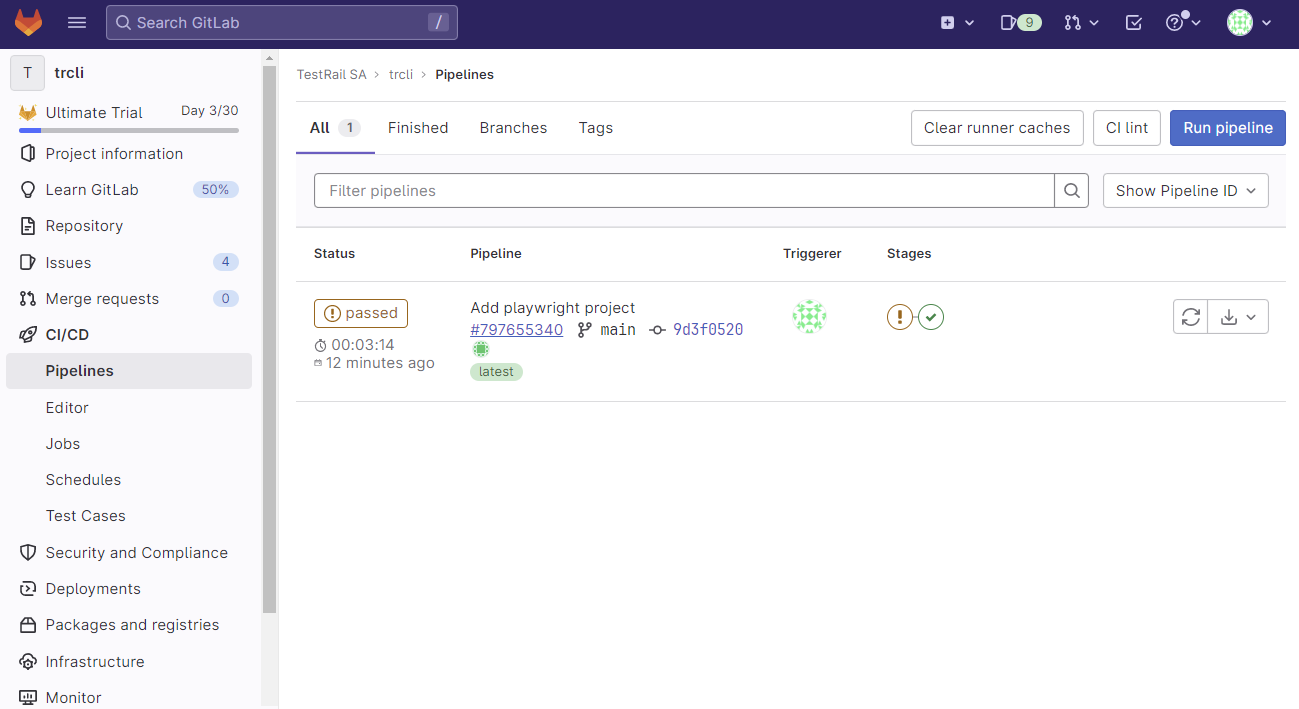 - パイプラインは CI/CD 用に設計されています。つまり、新規コミットのたびにパイプラインが実行されます。初めて GitLab にコードをプッシュすると、ただちにパイプラインが実行され、自動テスト プロジェクトを実行して結果を TestRail に送信します。パイプラインを参照するには、左側のパネルで [CI/CD] > [Pipelines] に移動します。最初のパイプラインの実行の詳細が表示されています。すべてが期待どおり実行されている場合、パイプラインが成功し、警告がレポートされているはずです。