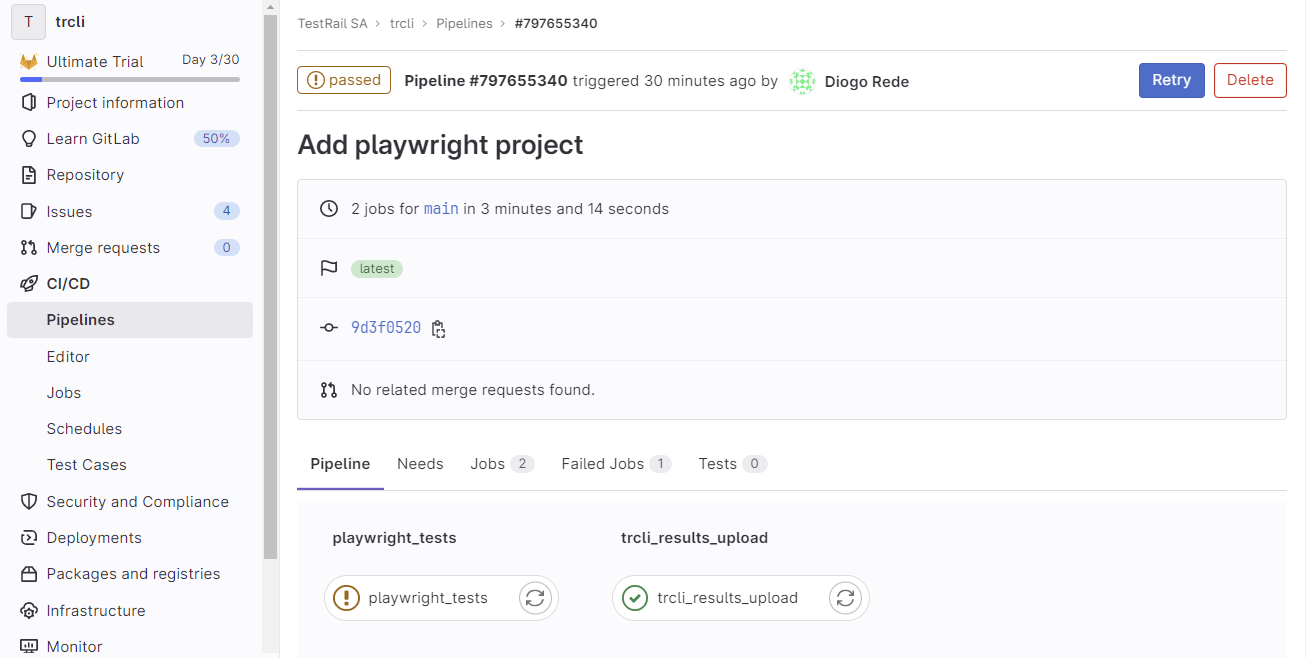 playwright_testsジョブと成功したtrcli_results_uploadジョブで構成されます。