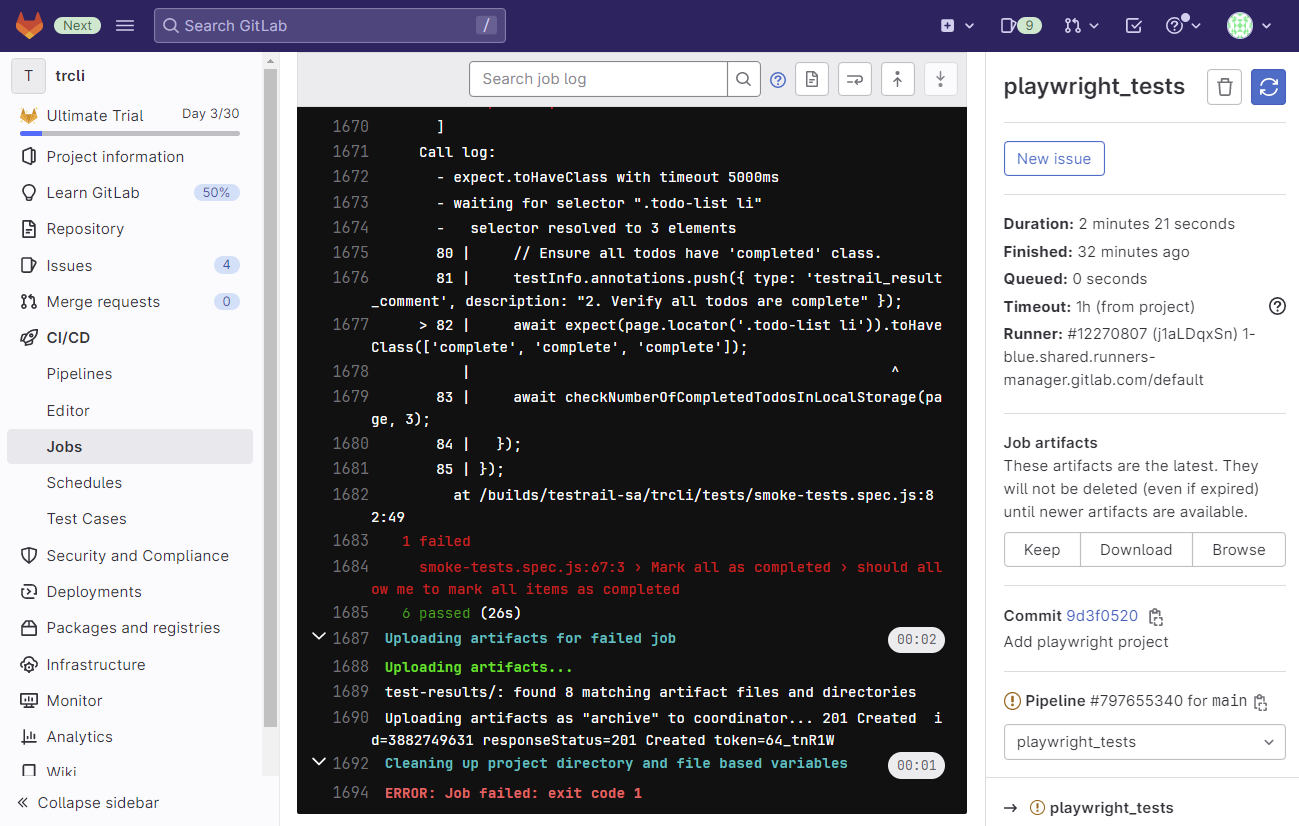 playwright_testsジョブをクリックすると、実行時間、成果物、コンソール ログなどのジョブの実行の詳細が表示されます。コンソール ログをざっと確認すると、1 つのテストが失敗しているために、ジョブも失敗していることがわかります。