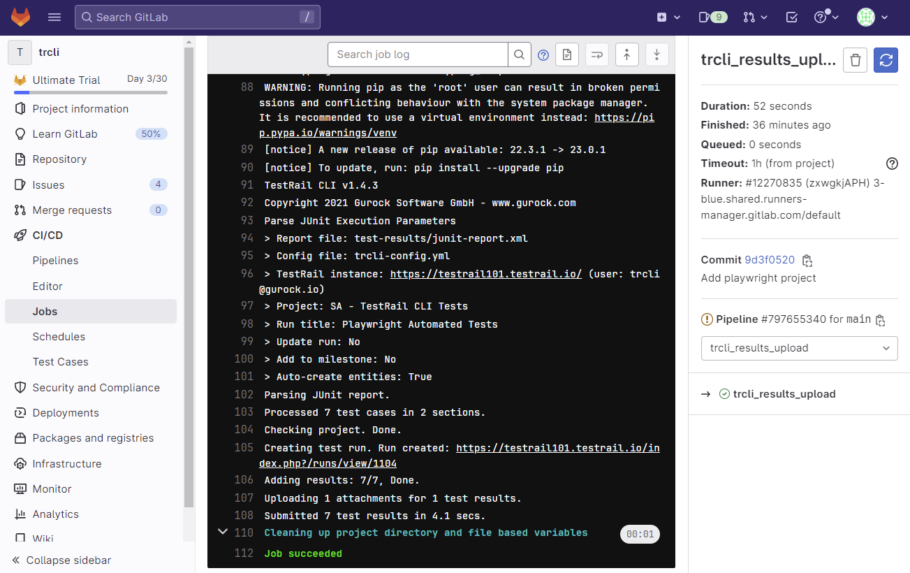 trcli_upload_results ジョブは、 Python コンテナーでシェル スクリプトを実行して TestRail CLI のインストールと呼び出しを行い、Playwright によって生成された JUnit レポートを解析して結果を TestRail に送信します。