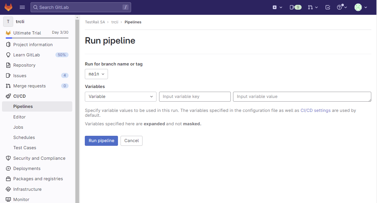- 上で説明したとおり、初めてテスト自動化コードをプッシュした後、コミットによって自動的にトリガーされた 1 つのパイプラインが表示されます。自動プロジェクトのコードに変更を加えずに自動テスト ケースを再実行したい場合、メイン画面の [Run pipeline] ボタンをクリックすると、新しいパイプラインを手動でトリガーし、実行対象のブランチを選択してランをサブミットできます。