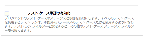 テスト ケースのレビューおよび承認プロセスを利用する場合は [テストケース容認の有効化] チェックボックスを有効化します。テストケース承認機能についての詳細はこちらをご確認ください。