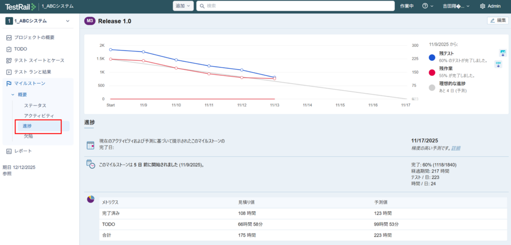 • バーンダウンチャートでテストの進行状況を視覚化し、現在の進捗状況から予測されるテストの完了日を確認することができます。