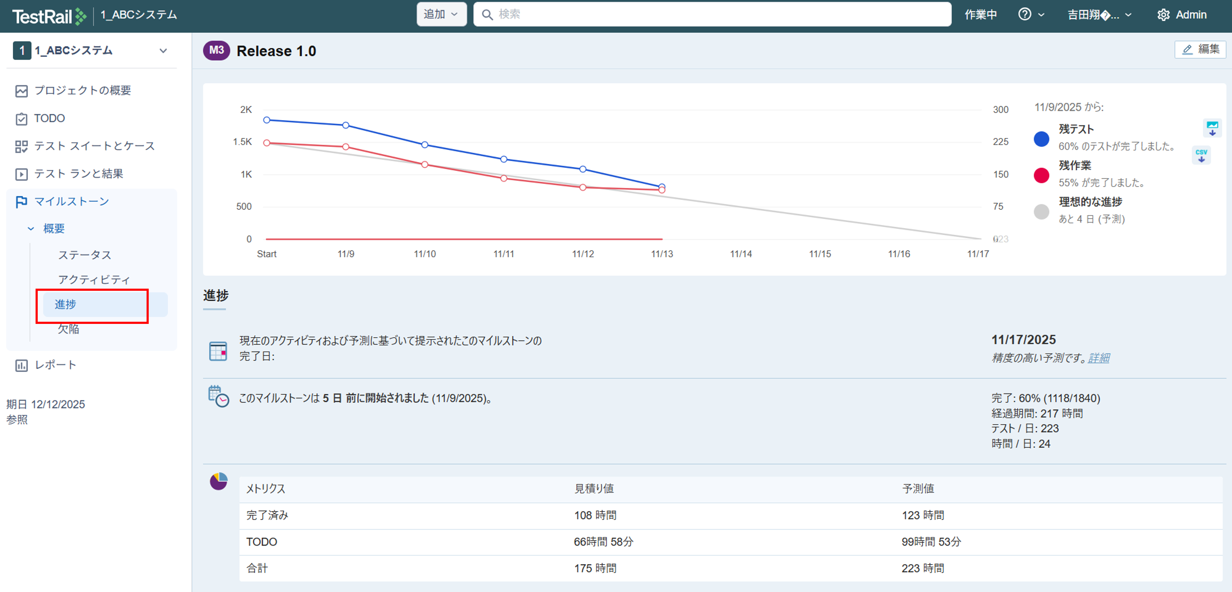 • マイルストーン、テストラン、テスト計画に関する詳細な進捗レポートを参照できます。