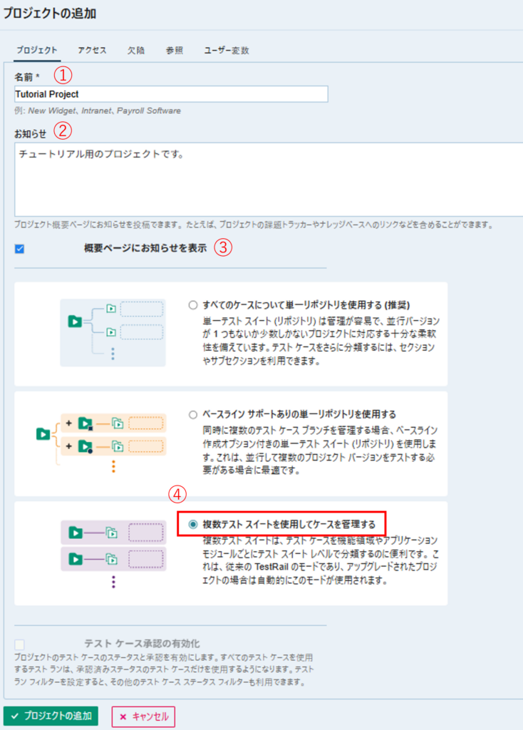 TestRail には 3 つのプロジェクトタイプがあります。それぞれテストケースの管理方法が異なるため運用にあったプロジェクトタイプを選択してください。各プロジェクトの詳細はこちらをご確認ください。