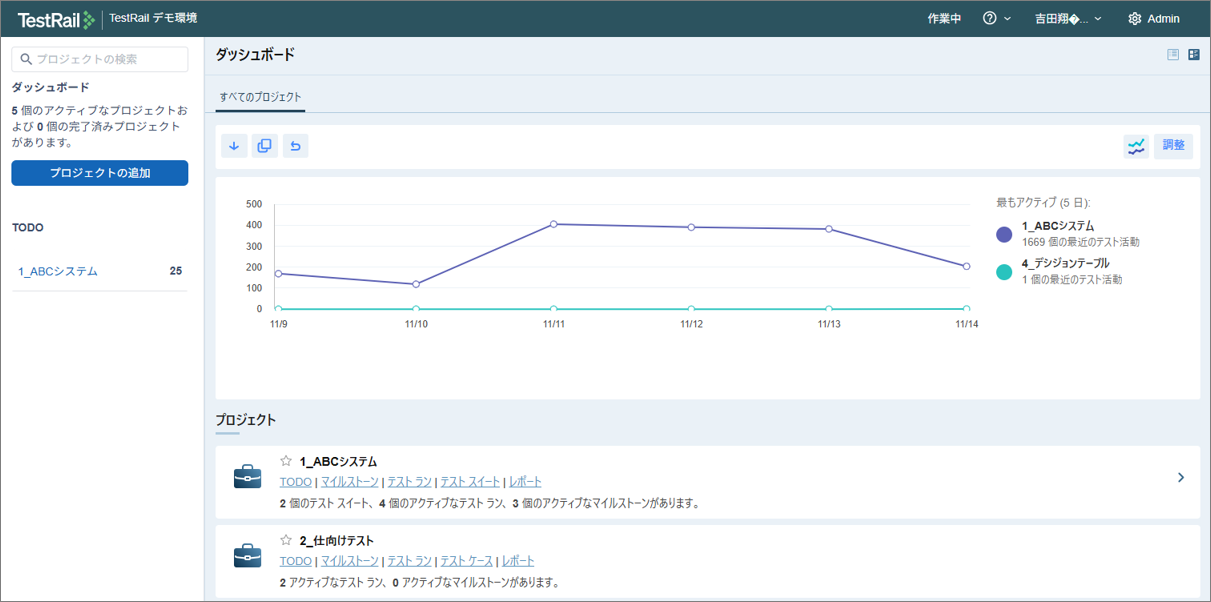 ダッシュボードから特定のプロジェクトを選択するとプロジェクトにおけるテスト活動を進めることができます。