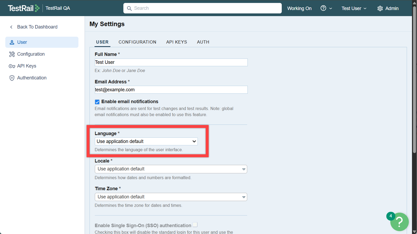 TestRail インスタンス内で、管理者は他のユーザーのユーザー言語を変更できます。インスタンス管理者がこの操作を行うと、次のセクションで説明するように、[言語] に「アプリケーションのデフォルトを使用する」を設定しているすべてのユーザの言語が変更されます。インスタンスに追加された新規ユーザーは、「アプリケーションのデフォルトを使用する」に設定されています。