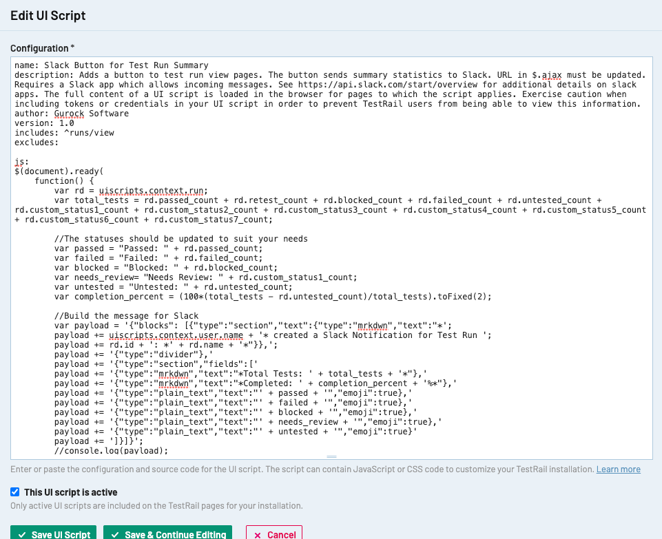 スクリプトが適用されるページでは、ブラウザーに UI スクリプトの完全なコンテンツがロードされます。TestRail ユーザーが情報を参照できる状態にならないよう、UI スクリプトにトークンや認証情報を含める際は注意してください。