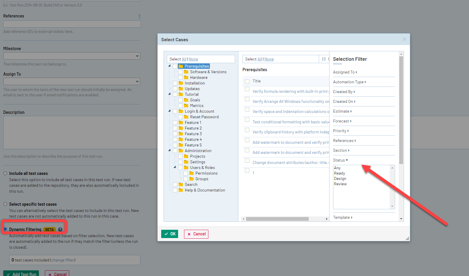 デフォルトでは、「すべてのテスト ケースを含める」テストランに、Ready 以外のステータスを持つテスト ケースは含まれません。テスト ランで承認済み以外のテスト ケースを使用したい場合、「特定のテスト ケースを選択」または「動的フィルタリング」を使用するテスト ランを作成します。テスト ランのケース選択にフィルターを適用すると、ダイアログの [選択フィルター] エリアにステータス フィールドが表示されるようになります。