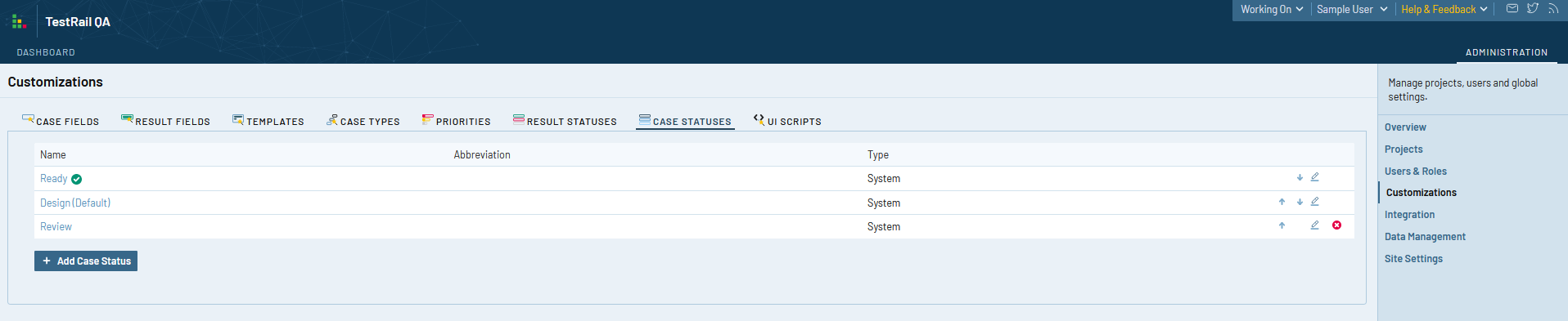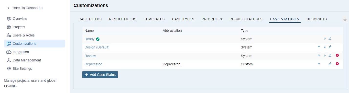 TestRail 管理者は、デフォルトのテスト ケース ステータスを参照し、ニーズに合わせて既存のステータスを編集したり、新しいステータスを追加したりできます。ステータスを設定するには、[管理] > [カスタマイズ] > [ケースのステータス] に移動します。既存のステータスを編集するには、ステータス名をクリックするか、テーブル右側のえんぴつのアイコンをクリックします。