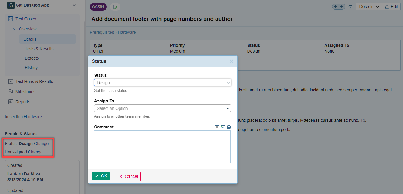 テスト ケースに変更が行われた場合、変更が行われ、まだ承認されていないことを示すため、ステータスは Design などのデフォルトのステータスに戻されます。テスターは、レビューアーにテスト ケースを割り当てます。レビューアーは、変更を承認したり、変更を却下したり、テスト ケースのバージョンにコメントを追加したりできます。