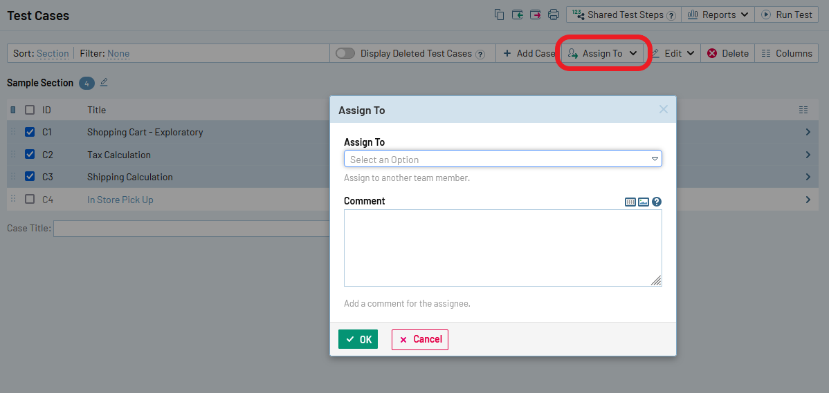 複数のテスト ケースを選択し、最上部の [Assign To] ボタンをクリックすると、割り当てやコメントの追加を一括して行うことができます。