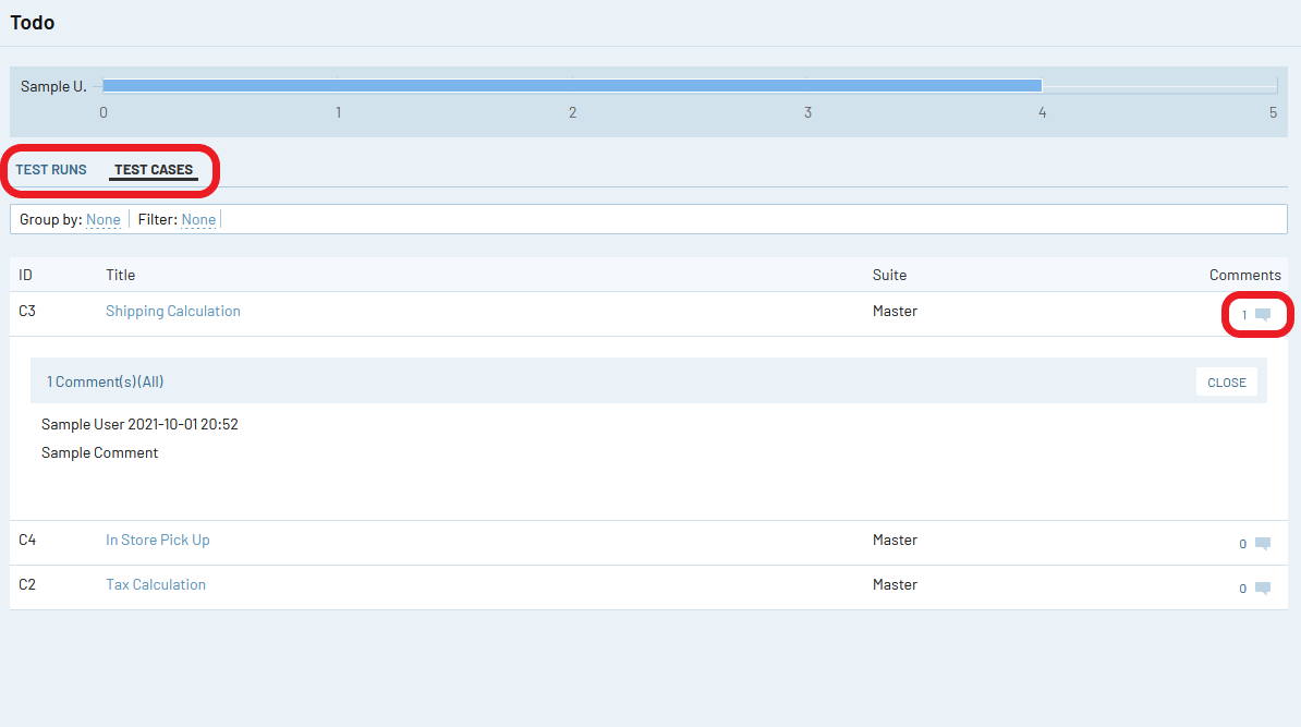 チーム メンバーのテスト ケース設計作業負荷を参照するには、プロジェクトの [TODO] タブをクリックし、[テスト ケース] サブタブを選択します。ここで、承認以外のステータスのテスト ケースを見つけられるので、ユーザーはどのテスト ケースに注意が必要かを確認し、テスト ケースに最近追加されたコメントをすばやく把握できます。