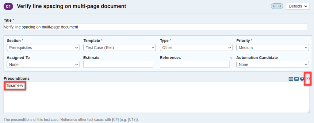 TestRail は、上記以外のフィールド、テスト ケースのタイトル、テスト ケース外のフィールド (セクション名、テスト計画の説明など) では変数の使用をサポートしていません。