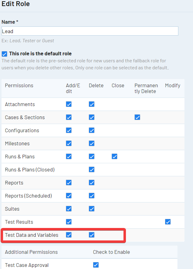 テスト データは、TestRail インスタンス内の各プロジェクト固有です。管理者はロールとパーミッションを使用してテスト データの使用を管理できます。“Lead”、“Tester”、“Guest” などのロールを作成し、各ロールのメンバーが実行するアクションに応じてパーミッションを適用できます。