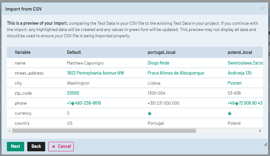 インポートされるデータのプレビューが表示されます。データをインポートする前に、プレビューが問題ないことを確認します。緑色のアイテムは、更新または新規追加された値であることを示しています。