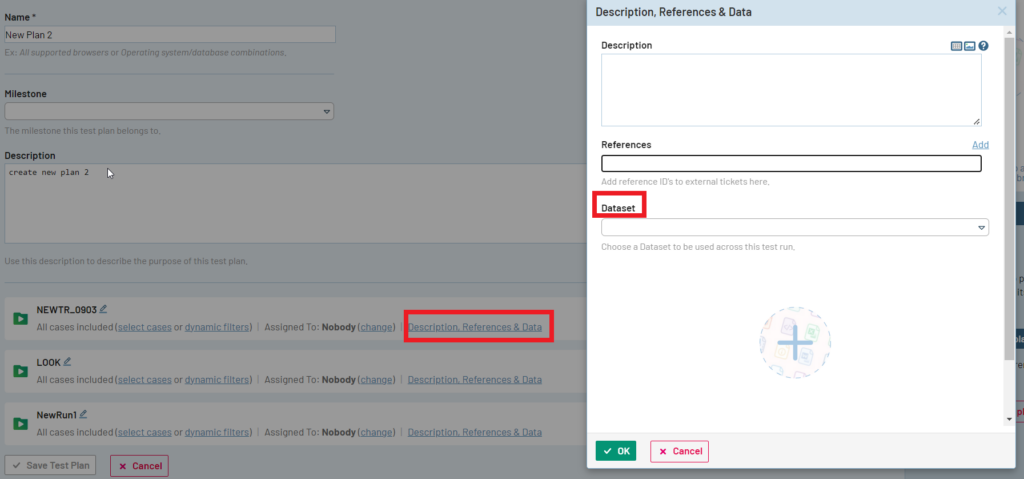テスト計画内のテスト ランでデータセットを使用するよう設定することもできます。それには、次の図のように [説明、参照およびデータ] をクリックし、ドロップダウン メニューからデータセットを選択します。