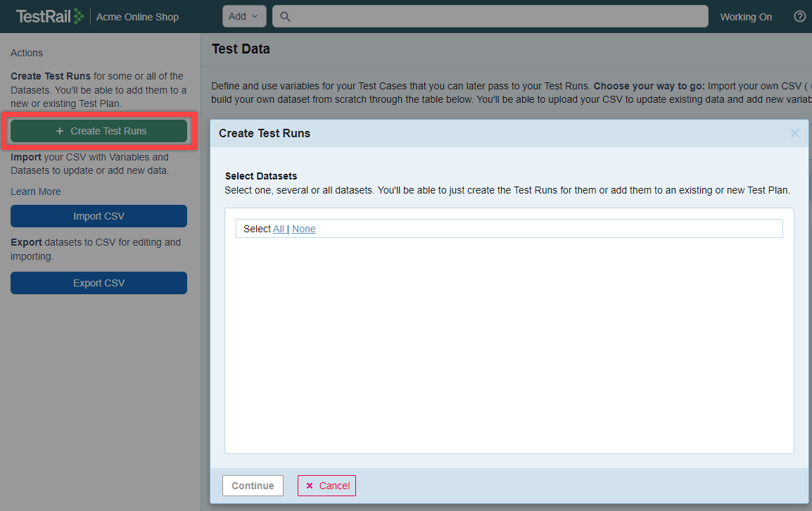 テスト ランで使用するデータセットを選択し、[続行] をクリックします。TestRail では、次のダイアログで示すように、選択したデータセットで何を実行するかを選択できます。