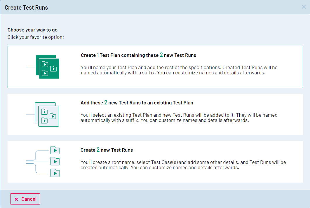 - 選択された各データセットに対応する新規テスト ランを作成します。テスト ランを既存のテスト計画に追加できます。このオプションを選択すると、ターゲットテスト計画を選択するよう求められ、選択された計画にテスト ランが自動的に追加されます。