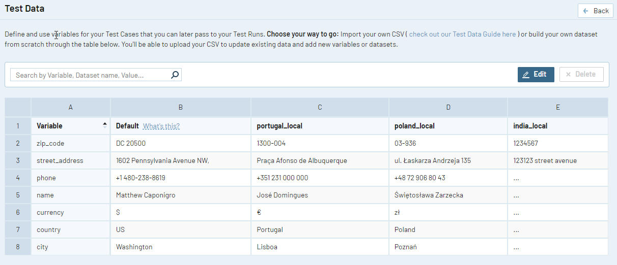 テスト データ管理エリアでは、新規テスト データ値を追加したり、既存のデータを参照および編集したり、CSV 形式でテスト データをインポートまたはエクスポートしたりできます。このビューには、既存のデータセットおよび変数のテーブルが表示されます。テスト データはプロジェクトごとに固有であることに注意してください。