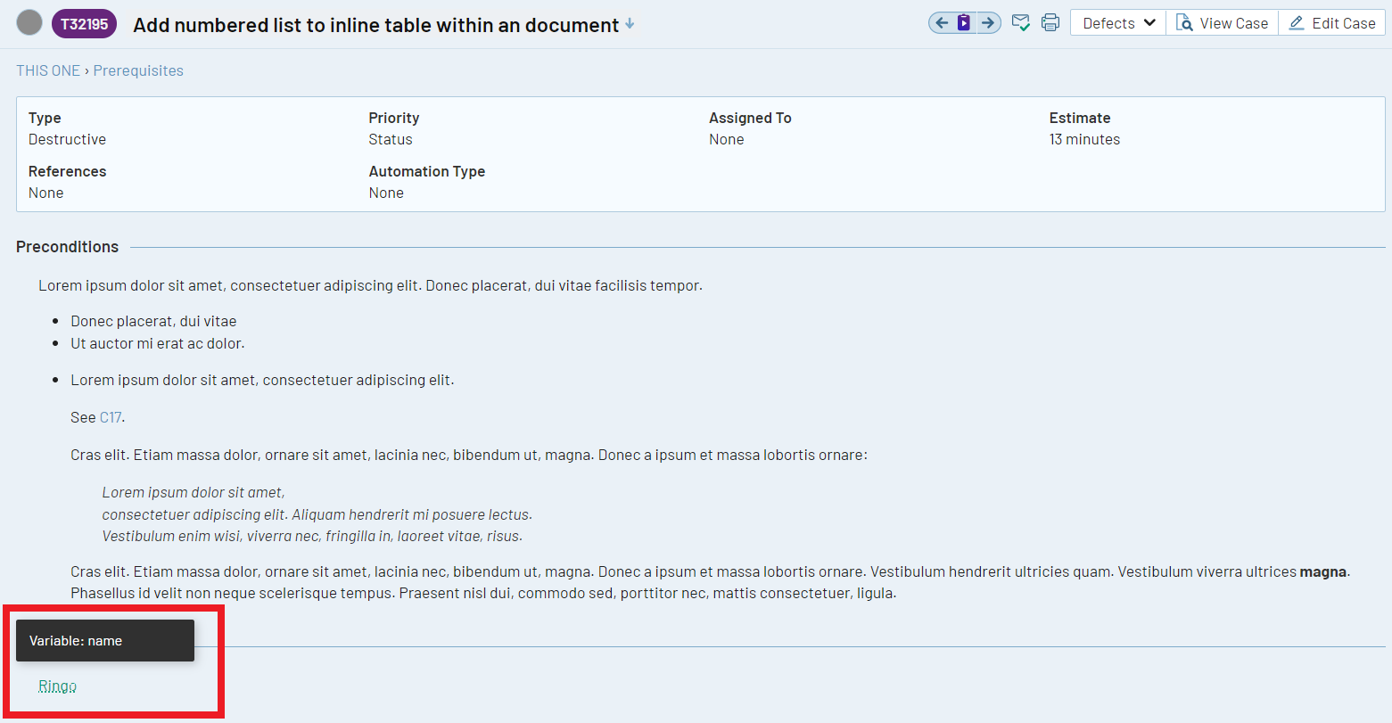 テスト ランでデータセットを使用しており、テスト ラン内のテスト ケースが変数を呼び出した場合、TestRail は、テスト ラン内のテストで関連付けられたデータセットの値を自動的に使用します。値はテスト内でハイライト表示され、どの変数が使用されているかが一目でわかります。