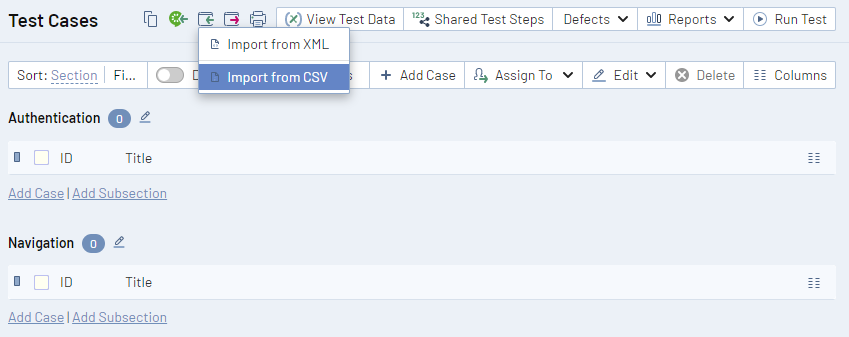 TestRail は、ヘッダー フィールドやテンプレート フィールド、個別のテスト手順やカスタム フィールドなども含めたすべてのサポート対象フィールドを CSV 経由でインポートできます。