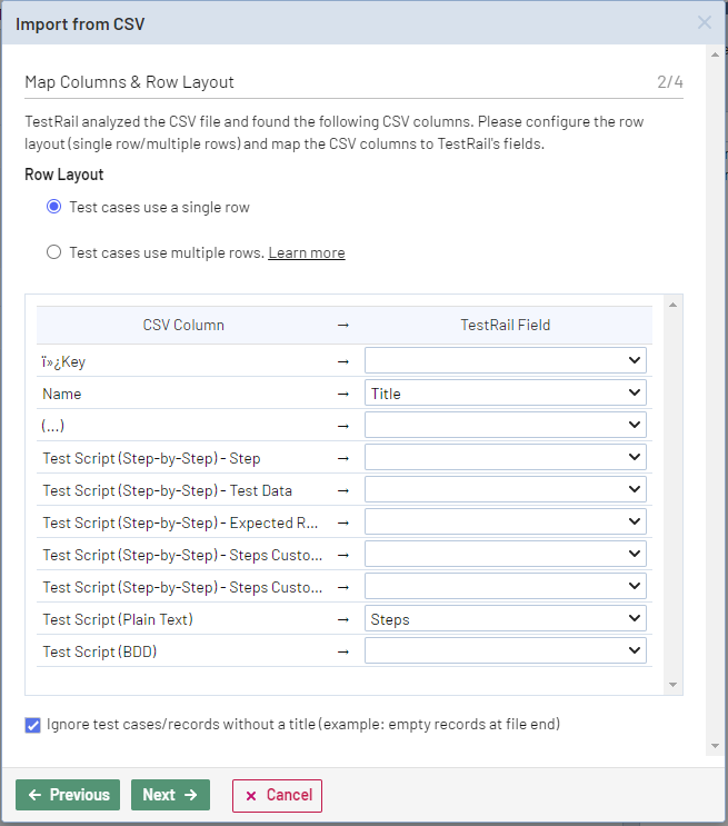 2. インポート ダイアログの 2 番目の画面で、[行レイアウト] に [テスト ケースは単一行を使用する] を設定し、Test Script (Plain Text) 列 (または Test Script (BDD) 列) を TestRail の Steps にマッピングします。