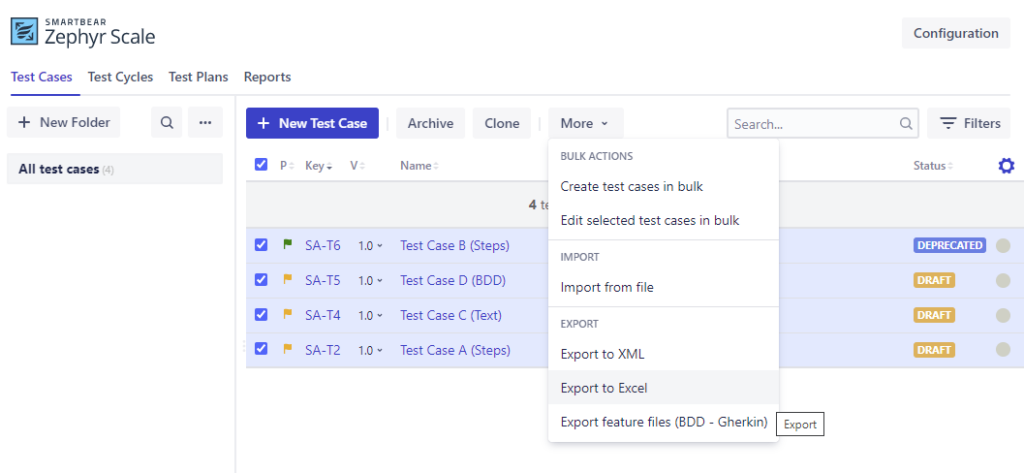 Zephyr Scale の [Test Cases] 検索画面から、テスト ケースを Excel 形式でエクスポートできます。エクスポート対象のすべてのテスト ケースを選択し、[More] > [Export to Excel] をクリックします。Excel ファイルのエクスポートとローカル マシンへのダウンロードが開始されます。このファイルを使用して、TestRail にテスト ケース データをインポートできます。