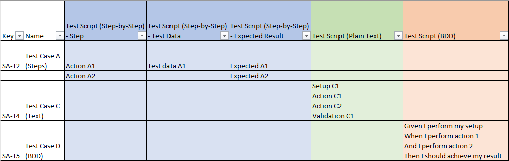 テスト ケースを Excel 形式でエクスポートすると、下の図のように、テンプレートの種類に応じて異なる列にテスト スクリプトが入力されていることがわかります。