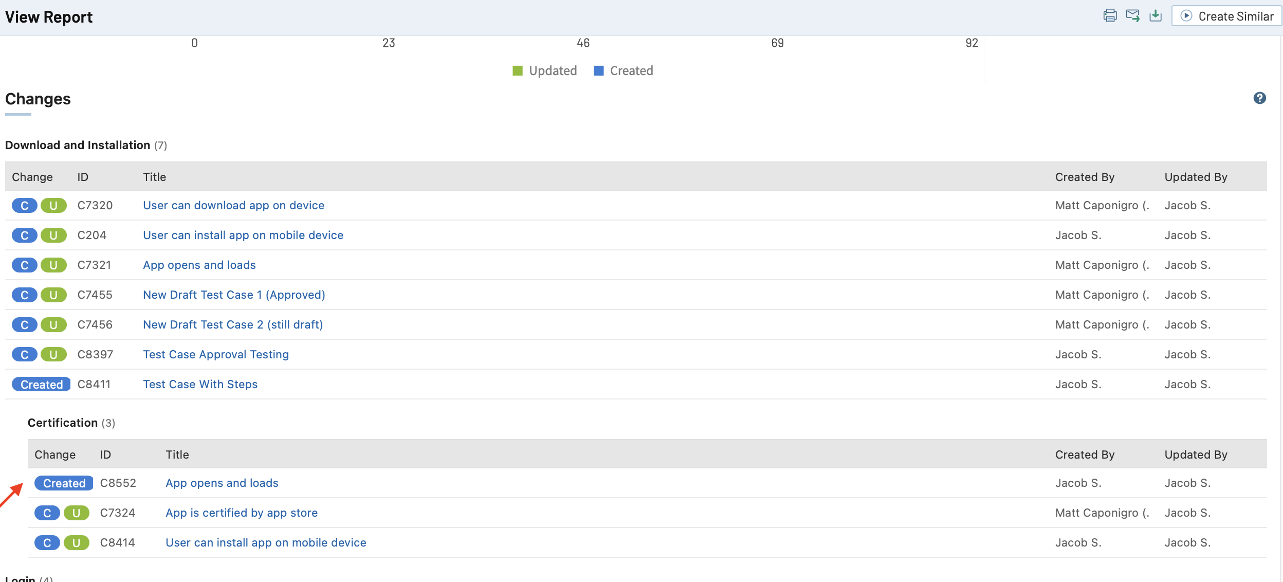 レポートをテスト ケースでグループ化した場合、変更の表には、レポートに含まれるすべての変更のリストが表示されます。セクション名の右に括弧で囲まれた数字が表示されます。この数字は、該当セクションで作成または変更されたアイテムの数を表しています。