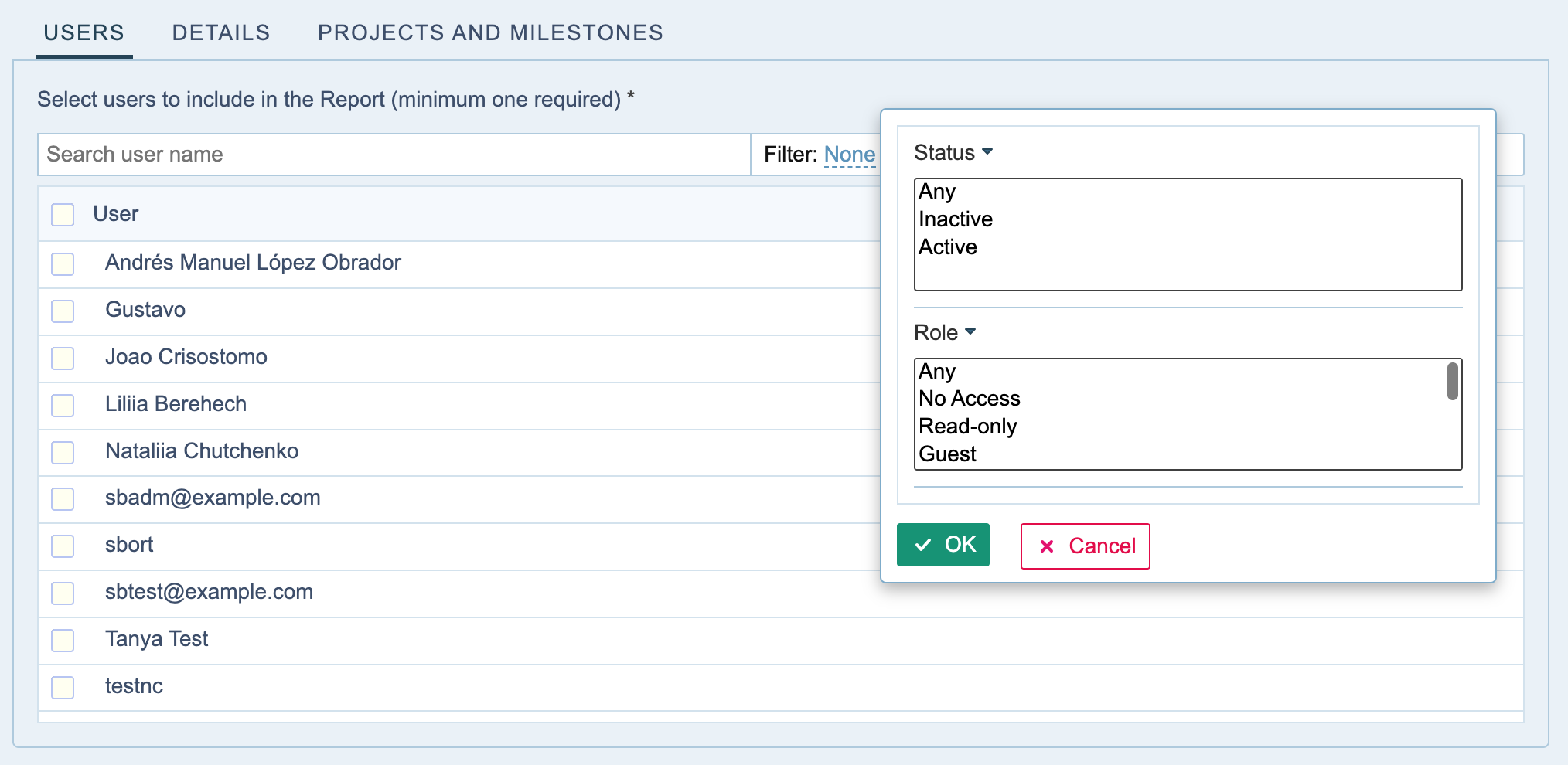 [レポートの追加] ページで [レポート オプション] セクションにスクロール ダウンします。[ユーザー]、[詳細]、[プロジェクトとマイルストーン] の 3 つのタブがあります。