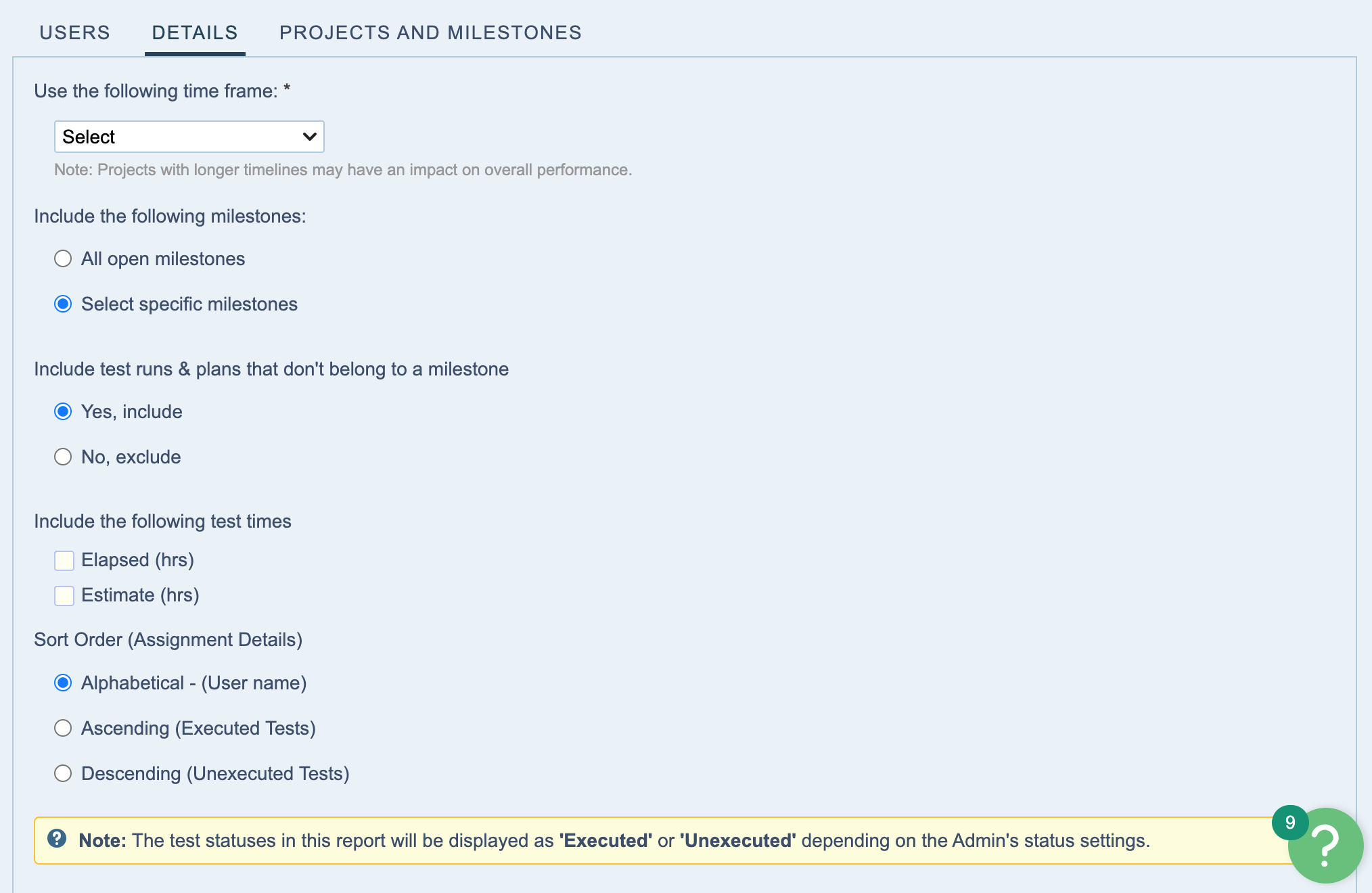 このセクションには、レポートに含まれるユーザーの数が表示されます。管理者は、実行済みまたは未実行とみなすステータスを指定したり、アクティブなマイルストーンデータのみをレポートに含めるように設定したりできます。