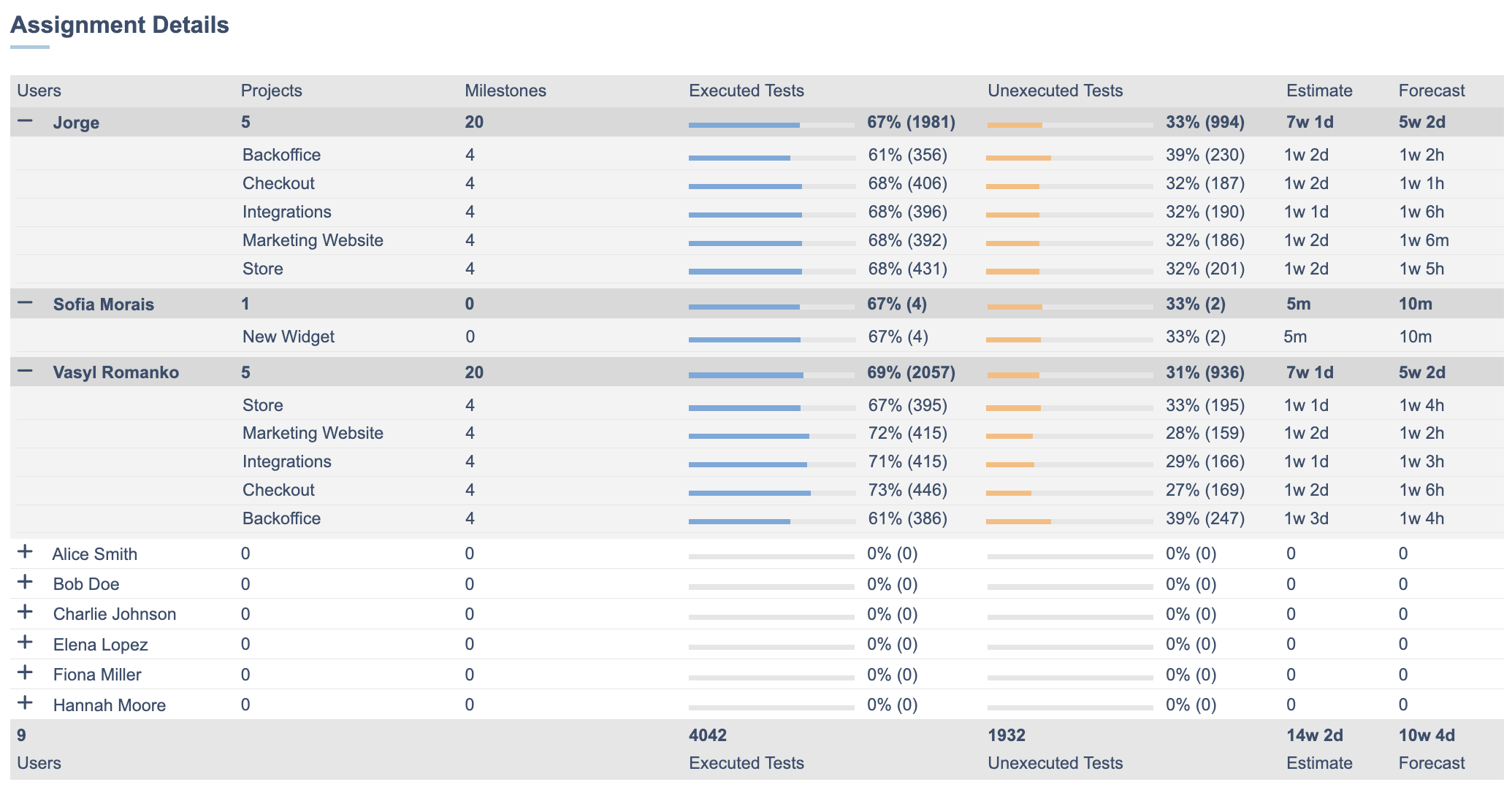 このレポート (Enterprise ライセンス プラン のみで利用可能) は、すべてのプロジェクトのすべてのテスト、割り当て済みのテスト、および未割り当てのテストの数を、各プロジェクトのユーザーごとのテスト実行の合計数と割合とともに表示し、未割り当てのテストを強調表示したり、サポートが必要なチーム メンバーや期待どおりに遂行しているチーム メンバーを特定したりするのに役立ちます。