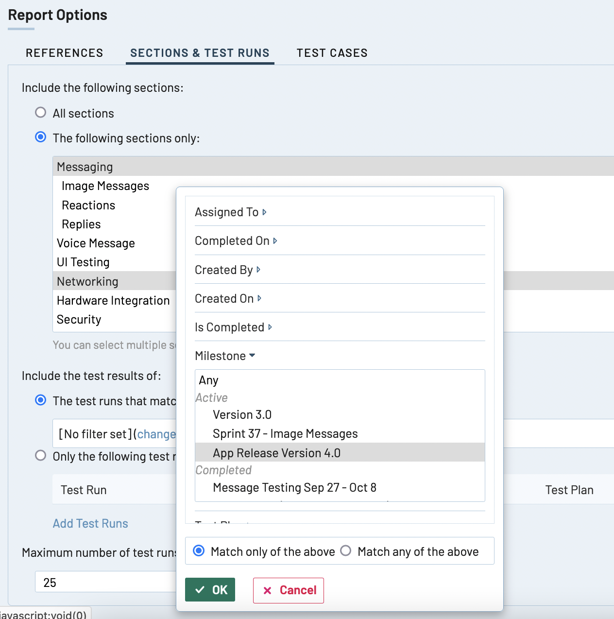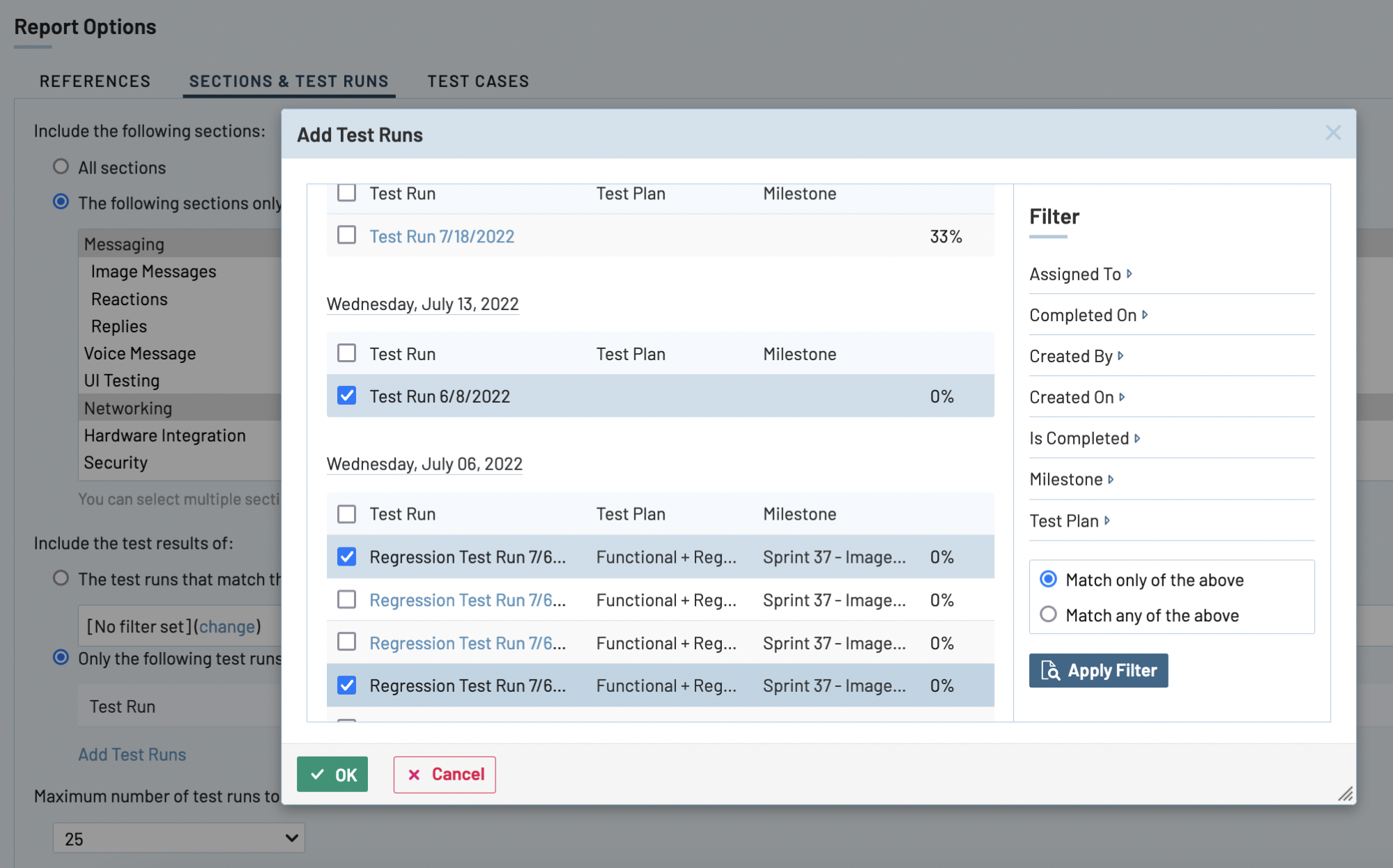 - テスト結果を参照するテスト ランを選択します。これには 2 つの方法があります。1 つ目の方法は、1 つまたは複数のフィルターを適用して、フィルターに一致するテスト ランを選択することです。担当者、完了日、作成者、マイルストーンなどのパラメーターを使用してテスト ランをフィルタリングできます。この方法は、特定の条件に当てはまる複数のテスト ランの結果を比較したい場合に役に立ちます。たとえば、特定のテスト計画内のすべてのテスト ラン、特定のリリースを追跡するために使用している複数のマイルストーンにわたるテスト ランなどです。