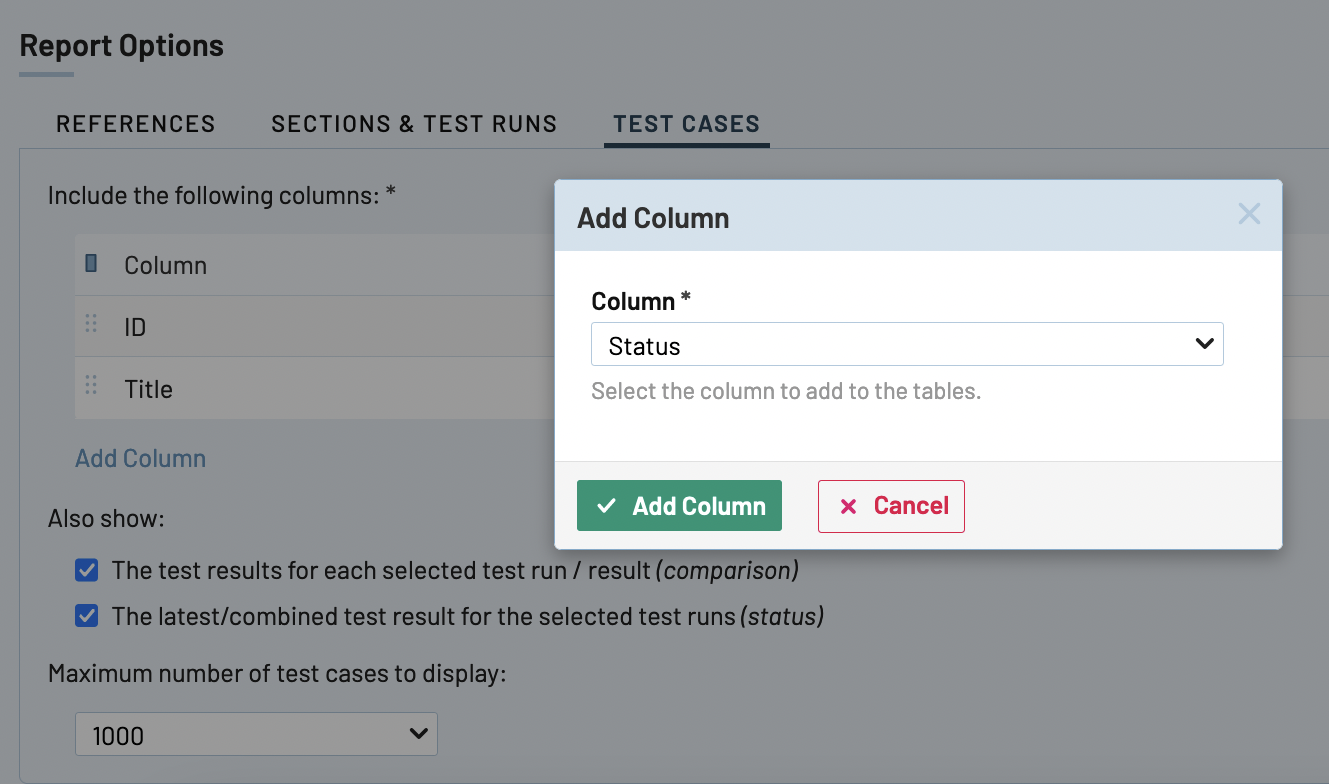 [レポートの追加] ページで [レポート オプション] セクションにスクロール ダウンします。[参照]、[セクションとテスト ラン]、[テスト ケース] の 3 つのタブがあります。
