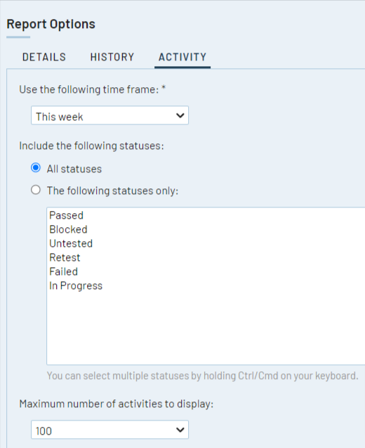 - デフォルトでは、すべてのテストケースが含まれます。特定のステータスのテスト ケースだけを表示するには、ctrl + click を押しながら、次の 1 つまたはそれ以上のステータスを選択します。Passed、Blocked、Untested、Retest、Failed、In Progress。