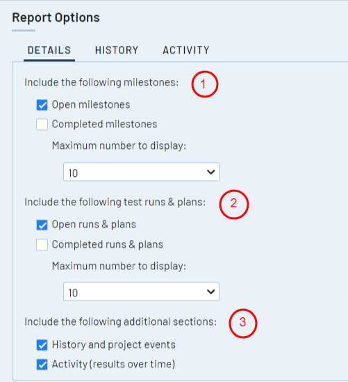 - マイルストーン データをレポートに含めるか、 また、テスト ランおよびテスト計画データをレポートに含めるか(それぞれ表示できるリスト項目の最大数は 25 です)。
