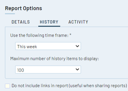 [レポートの追加] ページで [レポート オプション] セクションにスクロール ダウンします。[詳細]、[履歴]、[アクティビティ] の 3 つのタブがあります。