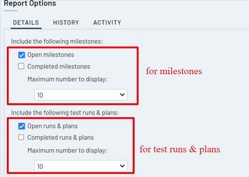 - レポートに表示するテスト ランおよび計画の条件を選択します。チェックボックスを使用してオープン中のランおよび計画、完了済みのランおよび計画、または両方をレポートに含めます。ドロップダウンを使用してレポートに含める最大アイテム数を 5、10、25、50、100 から選択します。
