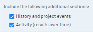 - 以下のセクションを含めるかどうかを選択します。履歴およびプロジェクト イベント、アクティビティ (一定期間の結果)、または両方。