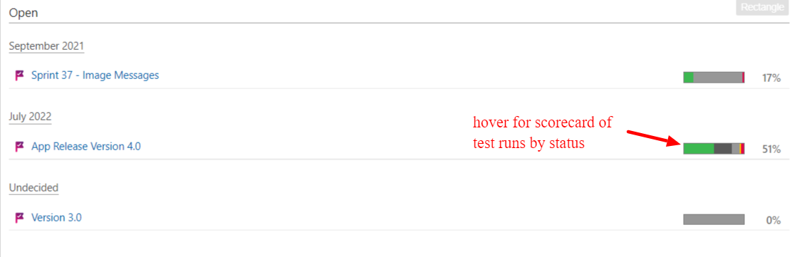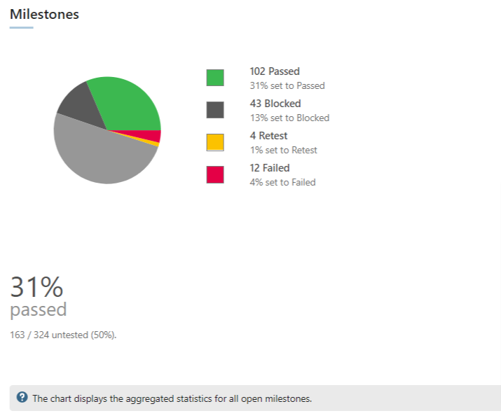 プロジェクト (サマリー) レポートは、TestRail プロジェクトのマイルストーンに関するすべての進捗およびアクティビティの概要とサマリーを提示します。レポートは、レポートに追加したすべてのマイルストーン全体の現在の進捗の概要とテスト結果に加えて、テスト アクティビティの進捗のサマリーおよびマイルストーン内で実行されたテスト計画のステータスの詳細な内訳を表示します。このレポートを使用すると、1 つのレポートに任意の複数のマイルストーンの概要を表示し、プロジェクト全体のマイルストーンのステータスをより分かりやすく視覚化できます。